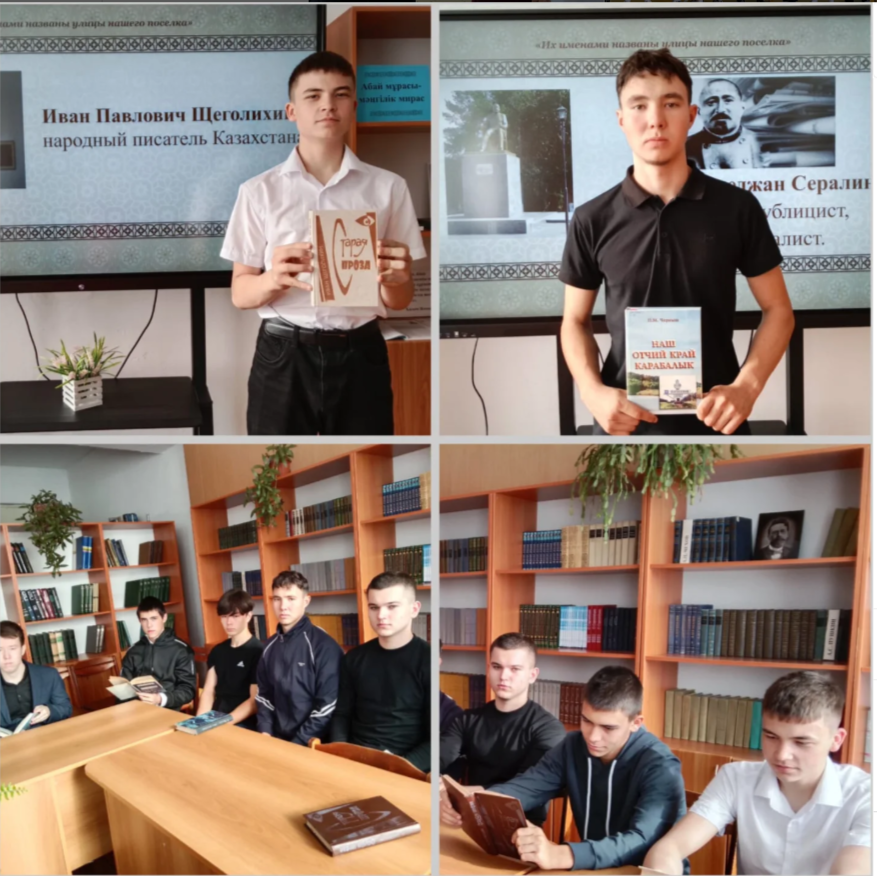 Бүгін колледж кітапханасында жерлестеріміз – Мұхамеджан Сералин, Қапан Бадыров, Серке Қожемқұлов, Иван Щеголихиннің есімдері берілген көшелерге арналған «Біздің ауылдың көшелері олардың есімдерімен аталған» атты өлкетану сынып сағаты өтті. Күн сайын біз таныс көшелермен жүреміз, олар кімнің есімдері бар екенін ойламай-ақ қояйық. Көшелер-бұл батырлар, ғалымдар, жазушылар, жұмысшылар туралы естелік сақтайтын ауылдың ерекше шежіресі. Бүгінгі сынып сағатында балалар біздің көшелеріміздің атымен аталған адамдардың кім екенін және олардың есімдері туған өлкенің тарихына неліктен жазылғанын есіне алды.